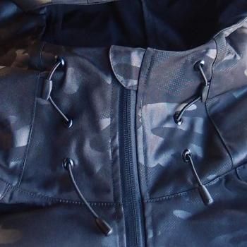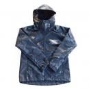 ラフテールオリジナルプリントシェルパーカ、防風性と撥水性を備えた素材を使用しています。ジップを上げると首まで防風できます。